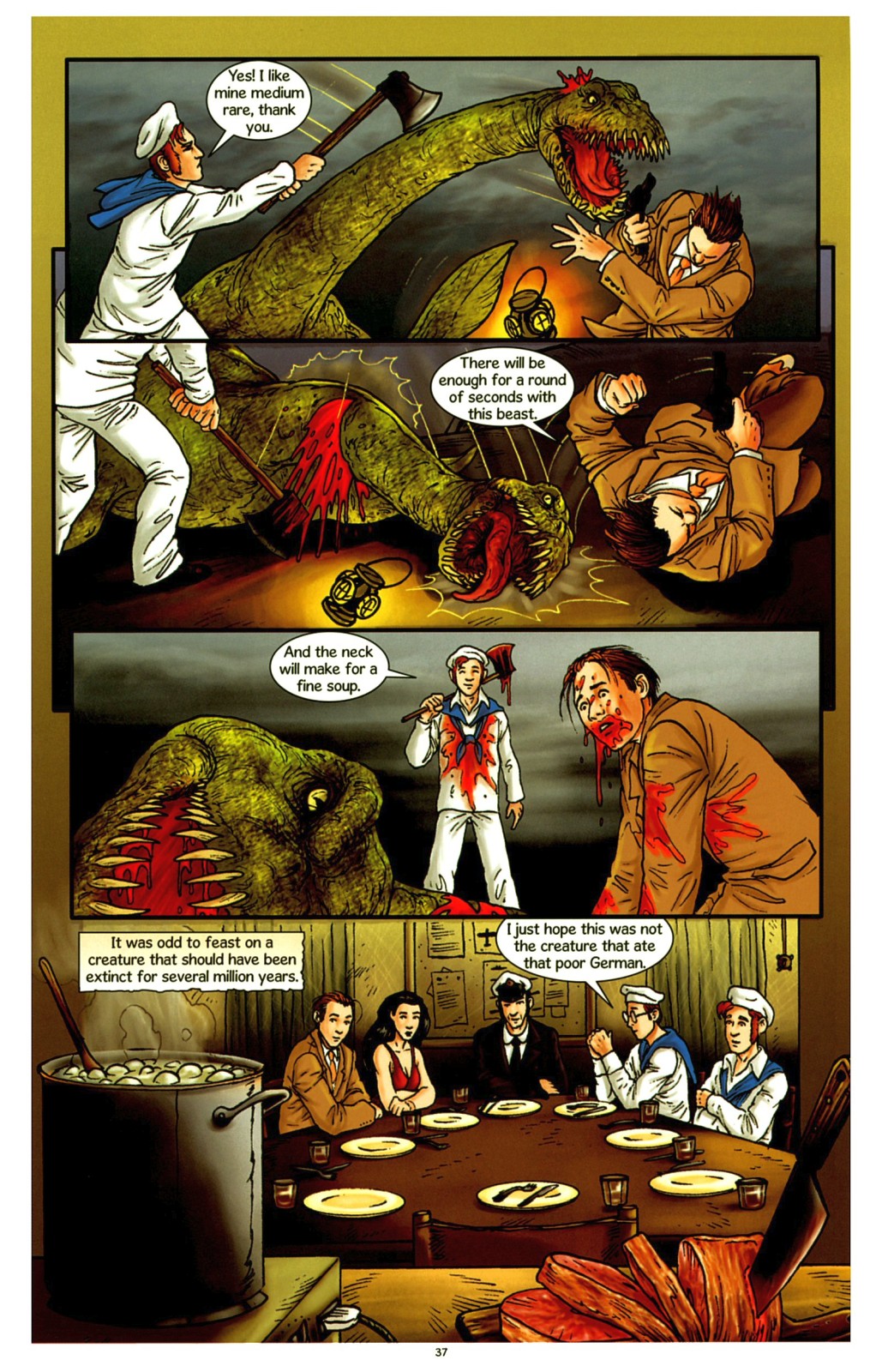The second creature is noticeably different, and much closer to the popular depiction of Plesiosaurus & the book - it's brown, at least, which is something not all adaptations manage to remember, as we'll see soon. This is the creature which made steak for the crew of U-33, although in the adaptation Olson's axework was substituted for the speedier and far less messy Bergmann MP18. Since the two creatures are quite evidently different species, let alone individuals, the remark about eating the same creature which ate the man in the book doesn't make much sense, so it's omitted entirely.